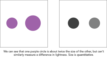 Quantitative variables allow an estimation of the actual numerical difference between symbols. Besides position, where we can guess the measurable distance between symbols, Bertin considered only size variation to be quantitative. For example, we can easily see that one symbol is twice the size of another—more or less.