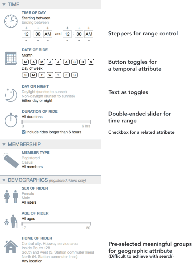 Most filter controls are implemented either as some kind of toggle (such as a checkbox) for looking at pre-defined categories or groups, or sliders for looking at ranges of time or data value. There are variations, though. See the variety on display below, for example.