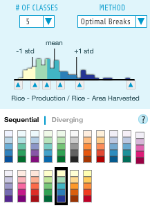 A final type of data manipulation is changing how the data is presented and symbolized. Again, this is not commonly called for, perhaps most rarely of anything in this section. Unless it’s requested and desired by an audience of expert users, think about how allowing a user to change, say, the choropleth classification method could ruin the story you’re trying to tell. (As we know, different classification methods can tell drastically different tales.) Even innocuous-seeming things added for flair, like color scheme options, could be risky—a map of sequential data could end up with a diverging or categorical color scheme, for example.