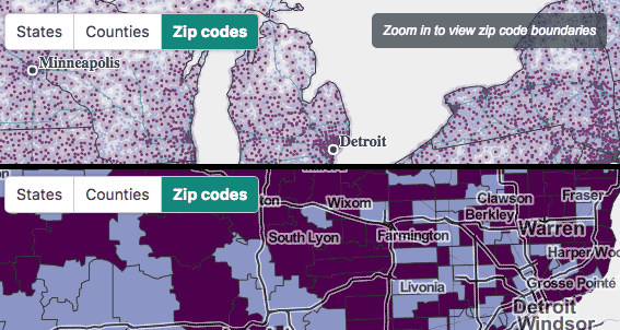 Not all geographic units can be treated equally. For example, some are too small to be legible at small scales, and too cumbersome to display on screen. It may be necesary to change symbolization along with units. In the map shown below, 32,000ish zip code tabulation areas would not only be too small to see but would also bring the map to a grinding halt if displayed as polygons. We show them as points until the map is zoomed in enough to display polygons in more managable chunks.