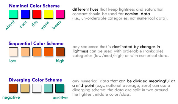 Nominal data are categories that are inherently unorderable (like soils or landuse) and should only be mapped with nominal color schemes. If you have orderable categories (such as low/med/high) or if you have numerical data, a sequential color scheme is what you need. Sequential color schemes can be single or multi-hue, but they are dominated and ordered by differences in lightness/saturation. Diverging schemes should only be used when your data has a natural mid-point such as a zero (e.g., positive and negative change/growth) or if you want to compare places to something like the national average (e.g., county data showing places that are above and below the national average for a variable like per capita income). A good place to find color schemes of each type is ColorBrewer, where you can also find more detailed discussions of their characteristics.