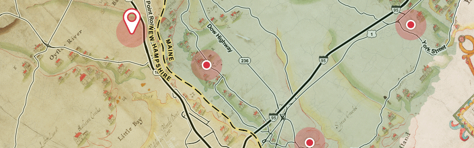This map was installed as an interactive touchscreen piece in an exhibit at the Old Berwick Historical Society's Counting House Museum, telling the history of settlement in the southern New Hampshire/Maine border region. The map features the stories of a number of important figures and locations in that history, which visitors can explore by tapping them to view associated text and images. Visitors can also explore a georeferenced historical basemap, and compare it to present day by fading between it and a modern basemap.