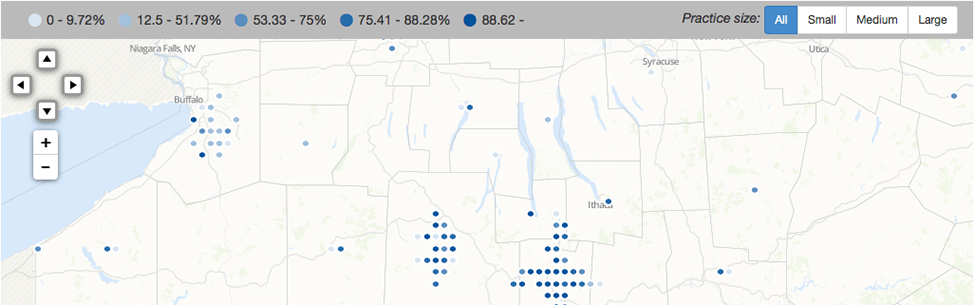 This small health-care visualization built for the state of New York focuses on performance measures of physician practices. The data points needed to be sufficiently anonymized and were placed on random points on a fixed grid within a set radius from their actual location. Users can view multiple performance measures and a data table showing total performance for each practice.